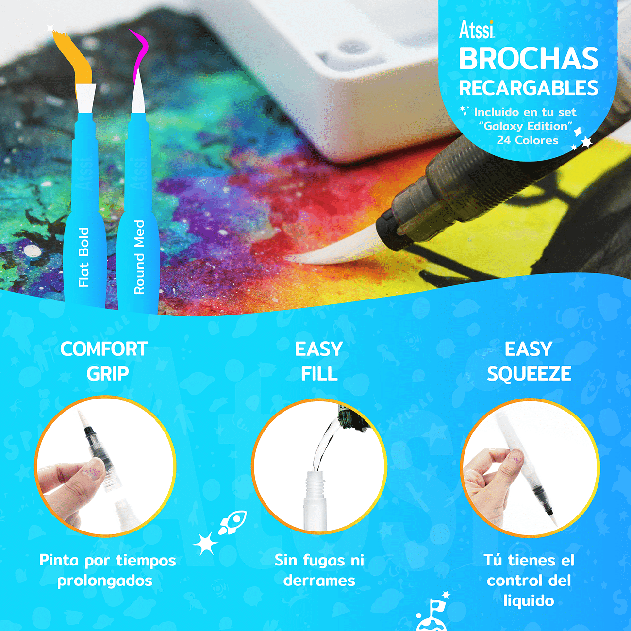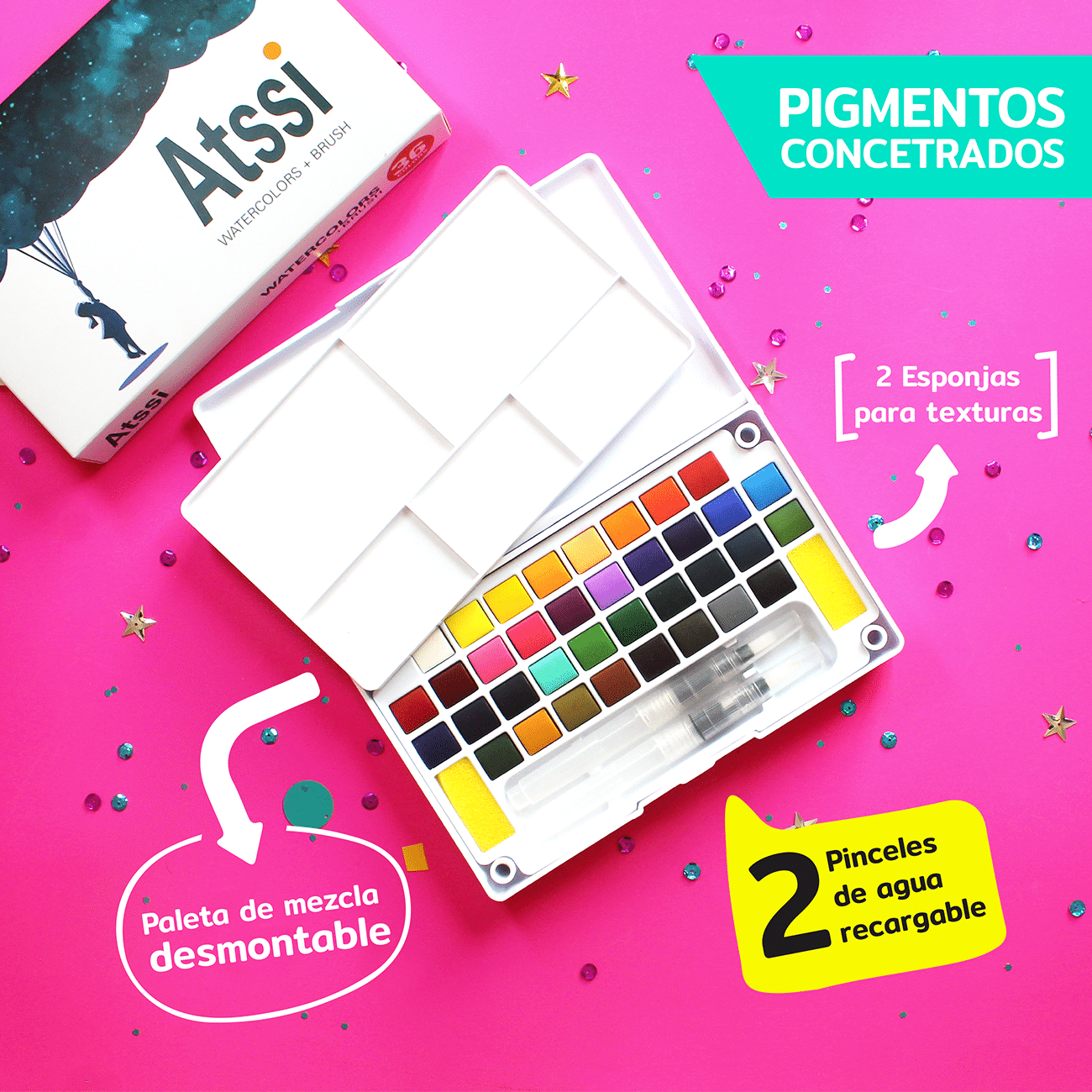 Incentiva tu creatividad con el set de acuarelas Atssi Galaxy Edition®. El diseño minimalista y su tamaño lo hace perfecto para pintar sobre la marcha. Es ideal para llevar al campo, la playa, la plaza o a su lugar favorito. El estuche es ligero, resistente al agua y es fácil de limpiar. El pincel de agua recargable te permitirá realizar trazos amplios y finos, perfecto para mejorar tu técnica de acuarela. Incluye 1 paleta desmontable para mezclar colores y 2 esponjas para pintar acuarela que te servirán para crear una variedad de efectos de textura.